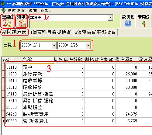 滑鼠點按[2傳票借貨平衡檢查] =>2 移到日期▼點按出日期區間查詢所有借貨不平衡的傳票, =>3