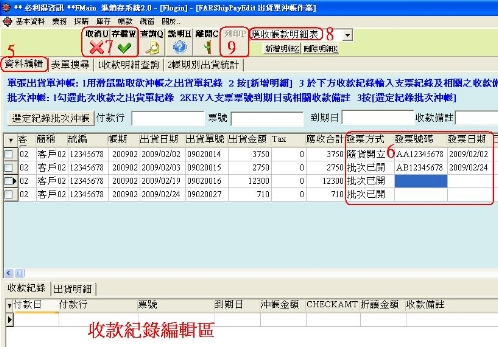 (注意帳期的區間) =>3 資料瀏覽區即顯示查詢結果(表單單頭) =>4 若無稅額, 請選擇[稅額以整批出貨金額計算]